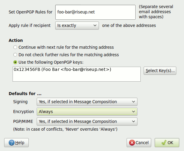 4. Choose the Action to be applied upon matching the rule. For this example, choose Use the following OpenPGP keys: and press the Select Key(s)… button. In the box that pops up from that button, select the OpenPGP key for the person to whom you’re sending email. If you don’t have their public key, press the Download missing keys button, which will search the key servers for the email(s) you entered in the matching box.